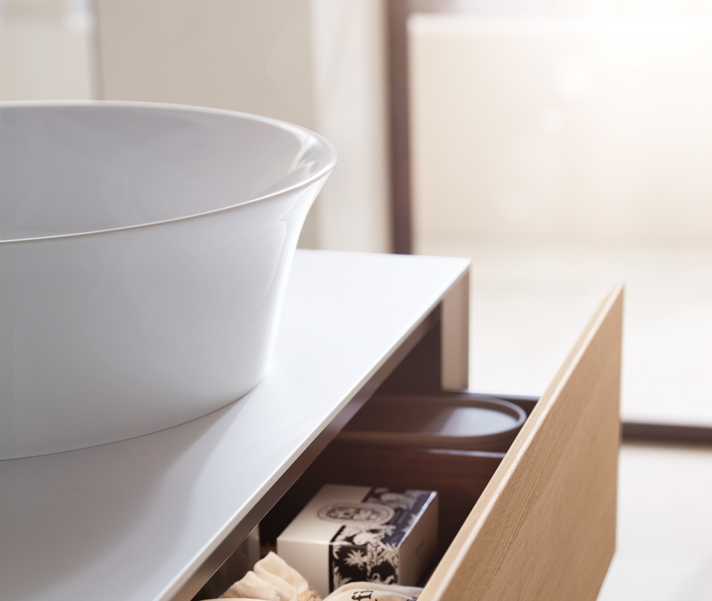 De combinatie van de ronde meubelwastafel met de bijpassende onderkast, in alle White Tulip meubeloppervlakken, biedt nog meer praktische opbergruimte. Ook de kleur van de leggers is vrij te kiezen.